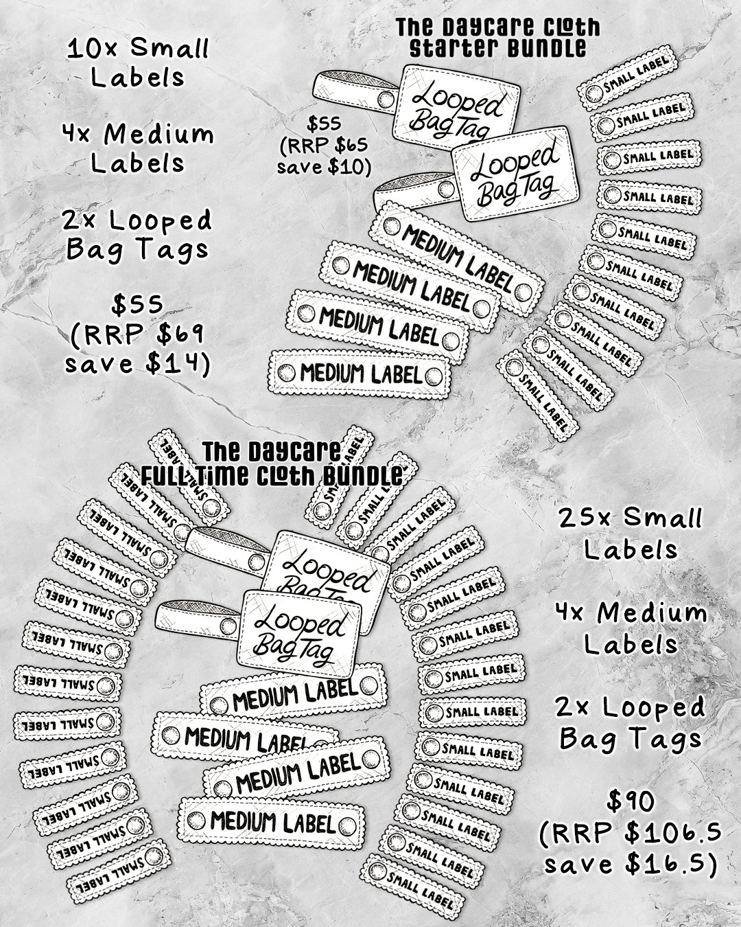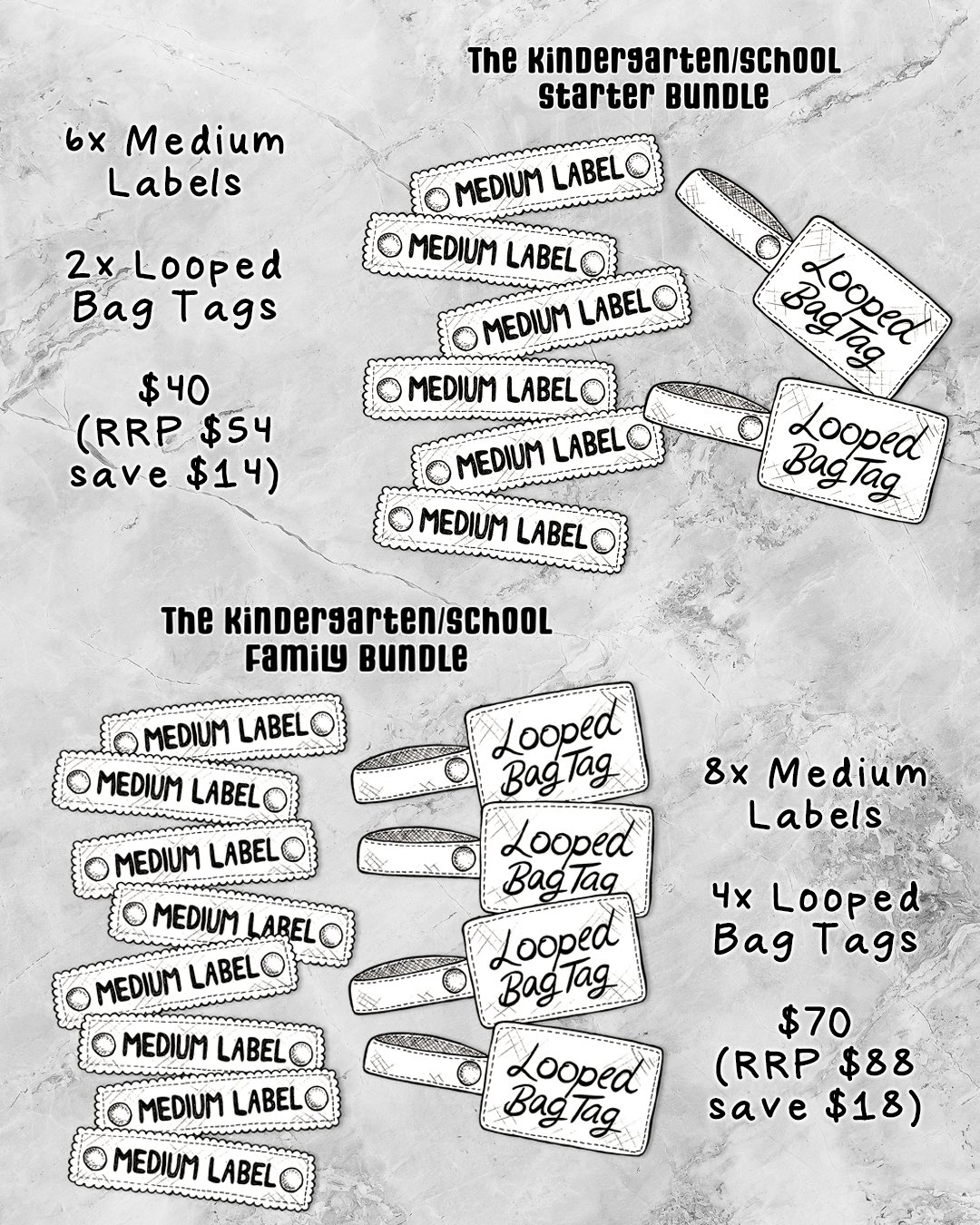 Customised label and tag sets are perfect for all your daycare, kindy, school, travel and home organisation needs!